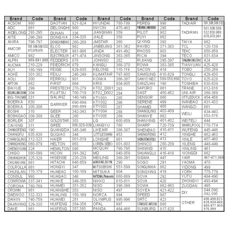 Chunghop K-1028E Code List : Universal Air Conditioner Remote Control Codes